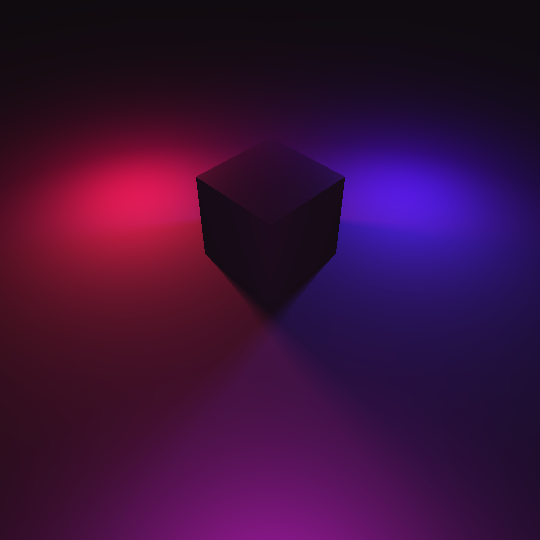And we'll also add lights at infinite distance. These are lights that we model as being infinitely far away, which are good for light sources meant to imitate the sun. The direction to these lights is a constant everywhere in space and we don't apply the inverse square law for obvious reasons. These lights are also always sharp. Here's a render using a couple of those.
