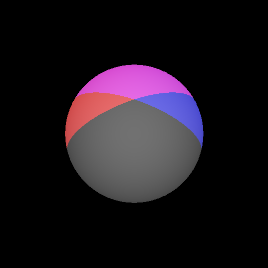 It's not too impressive yet, but it certainly demonstrates that the program is working. The next step is to properly implement lights. Lights can be fairly complex, they can be different brightnesses, colors, and as we'll see it pays to be able to set them as having different sizes as well. There are also different types of light, such as light sources that are so far away that all the incoming light is effectively parallel. For now, we'll stick with point lights and we'll make sure to set the falloff according to the inverse-square law. The below image is the same sphere lit by a red light and a blue light. It is also lit by a light at the camera's position to show the whole sphere.