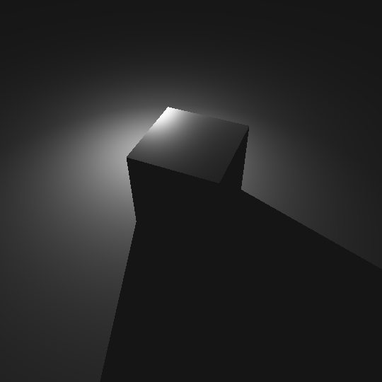 Now we just have to figure out soft shadows. Unfortunately, without casting more rays, the points currently in shade will always be in complete darkness. We can darken the points just outside the shaded area, however, by analyzing the behavior of the light ray. In particular, we want to know how close it came to hitting the cube. We'll record the smallest distance estimator value as the ray travels, and if it ever increases again then we'll say that this value is our closest approach. We'll also record the position the ray was in at that time.