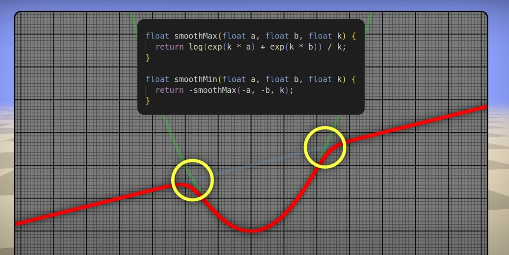 This function is exactly the same as the one for smoothing between distance estimators from that one video I linked at the start, albeit in a different form. Neat!