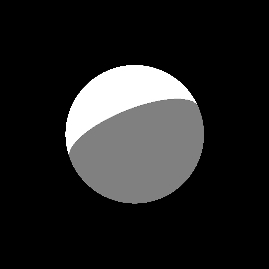 The first render will be of a simple sphere. I cast rays for each pixel, offset according to their positions, and test for collisions. If they collide, the pixel will be white, otherwise black. Of course this will amount to nothing more than the world's most inefficient circle-drawing algorithm, so I should add shadows in. For now, I'll use a method discussed down the line which just casts a ray from the light source to determine whether the point can see the light, and shade it accordingly.