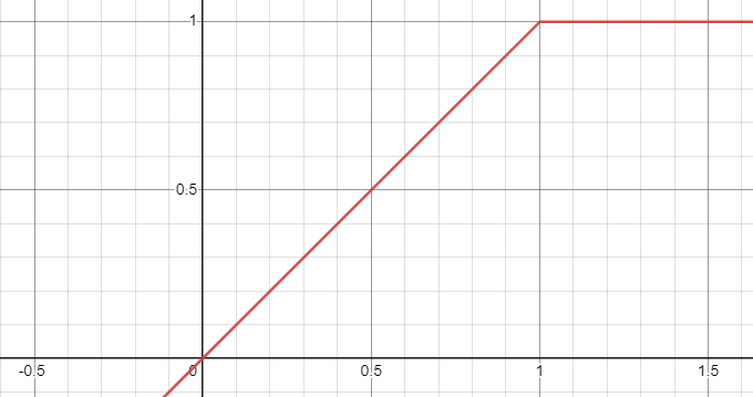 The x axis represents the brightness of the point and the y axis represents the brightness that we write to the pixel. Don't worry about the scales, they're arbitrary. The problem we're having is the sharp corner at the end there. The color gradient goes from smoothly changing to flat across a boundary line. It'd be better if we had a smooth change.